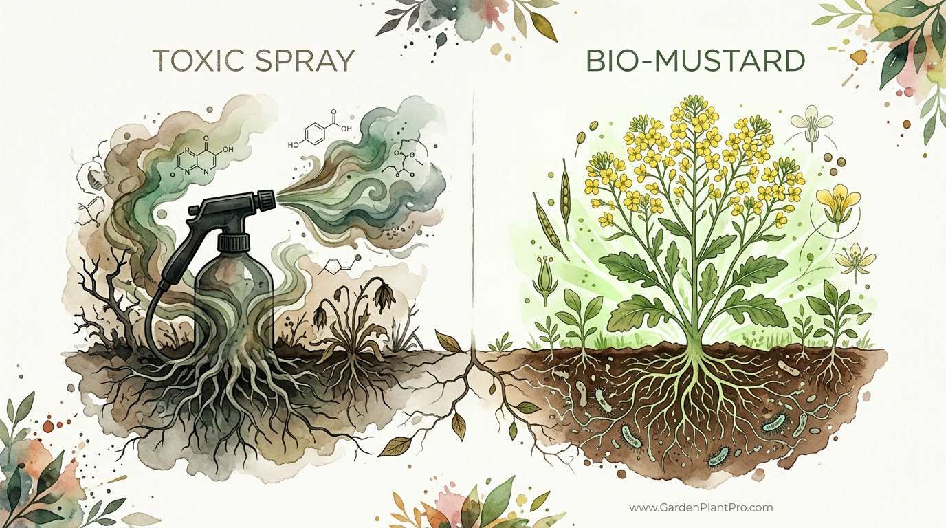 Then I learned about biofumigation. It’s a bit of old-world wisdom that’s been backed up by modern science. Instead of a TOXIC SPRAY, we use a BIO-MUSTARD cover crop. It’s a specialized variety of mustard that you grow specifically to till back into the earth. It feels like a bit of magic, but it’s actually just clever chemistry that the plants do for us.